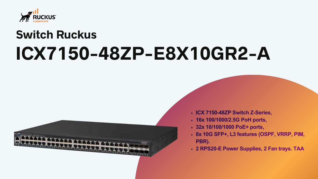 ICX 7150-48ZP Switch Z-Series, 16x 100/1000/2.5G PoH ports, 32x 10/100/1000 PoE+ ports, 8x 10G SFP+, L3 features (OSPF, VRRP, PIM, PBR). 2 RPS20-E Power Supplies, 2 Fan trays. TAA