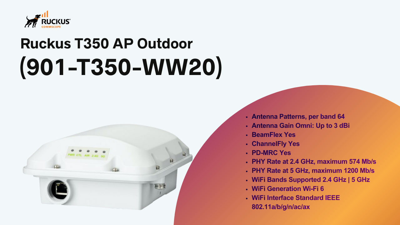 RUCKUS T350c (901-T350-WW20) là giải pháp Access Point ngoài trời cân bằng hoàn hảo giữa hiệu năng WiFi 6 mạnh mẽ, độ bền công nghiệp và hiệu quả kinh tế.